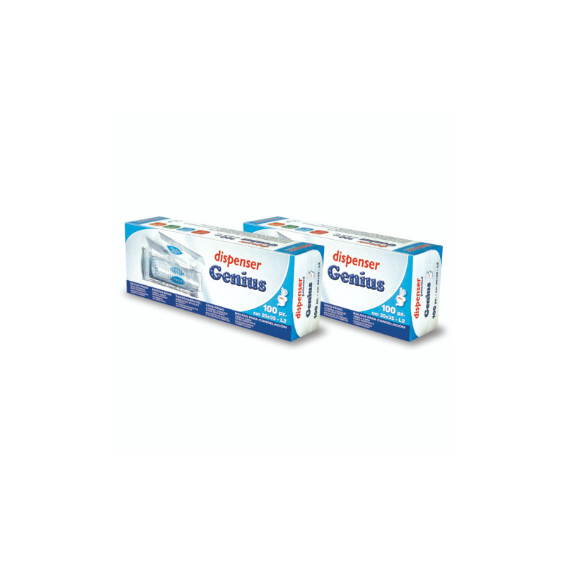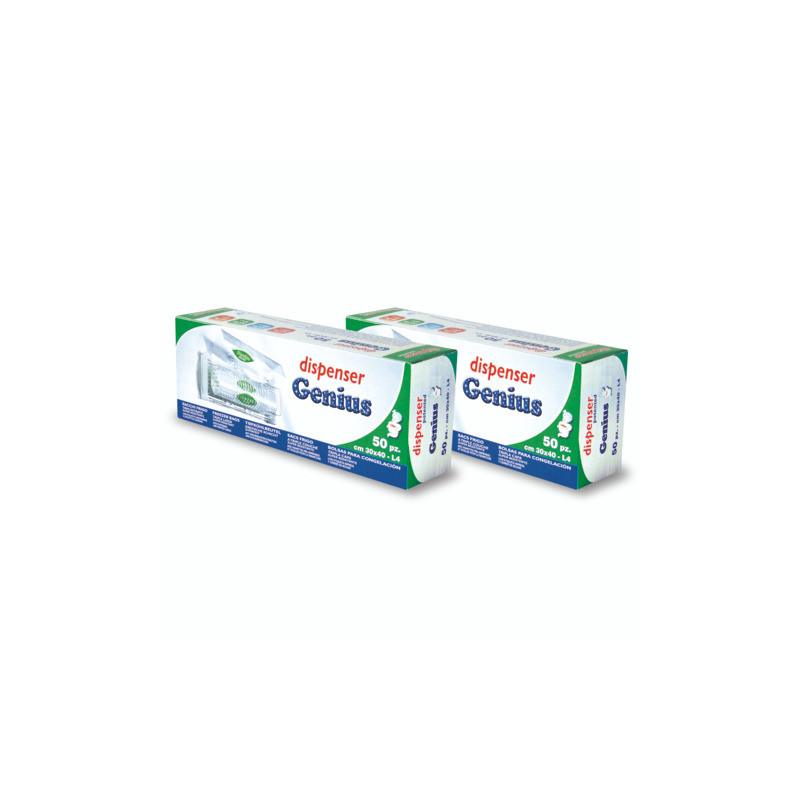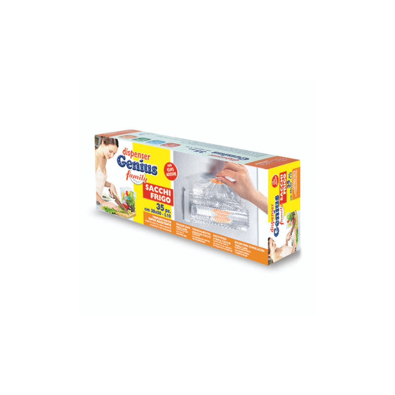 Dispenser di sacchi frigo Genius con clips adesive formato famiglia. GENIUS distributore di sacchi in rotolo per la conservazione dei cibi. Consente l'estrazione di un singolo sacco garantendo igiene ed evitando sprechi e disordine. Realizzato in LDPE triplostrato con tabellina per descrivere il contenuto.