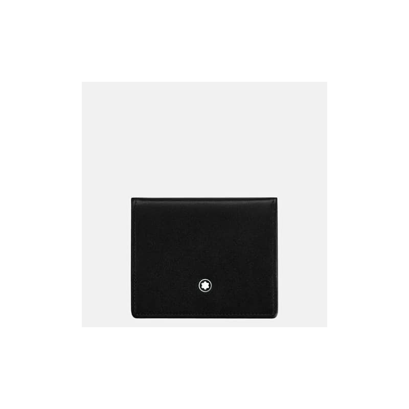 Portamonete piccolo con chiusura a pressione in pelle di vitello nero in pieno fiore europea, anello Montblanc con finitura in palladio. Spaziosa tasca per le monete e chiusura con bottoncino a pressione. Dimensioni 85x15x70 mm.