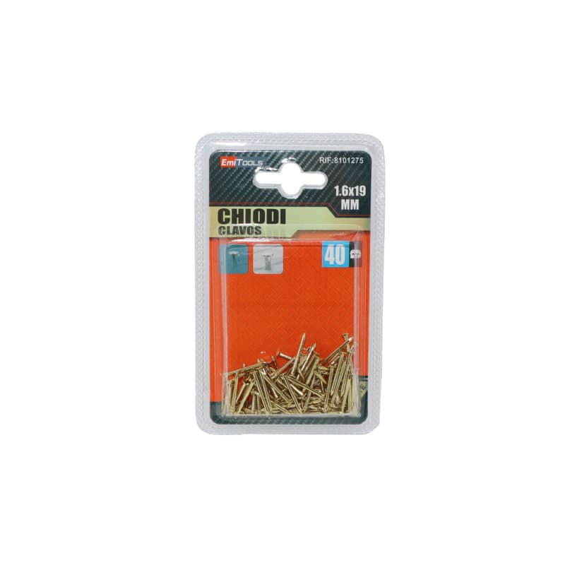 Chiodi in acciaio dorato per uso domestico. Dimensioni: 19 x 1,6 mm. Confezione da 40 grammi.