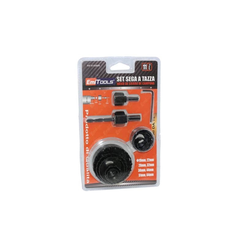 Kit di tazze circolari in acciaio per forature su legno o plastica in genere. Confezione da 11 pezzi.