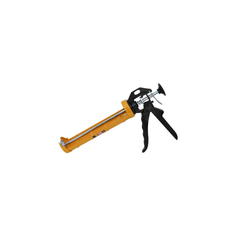 Pistola in acciaio con sistema classico di avanzamento e scarico per tubi di silicone/colla/mastice. Dimensioni: 330 mm.