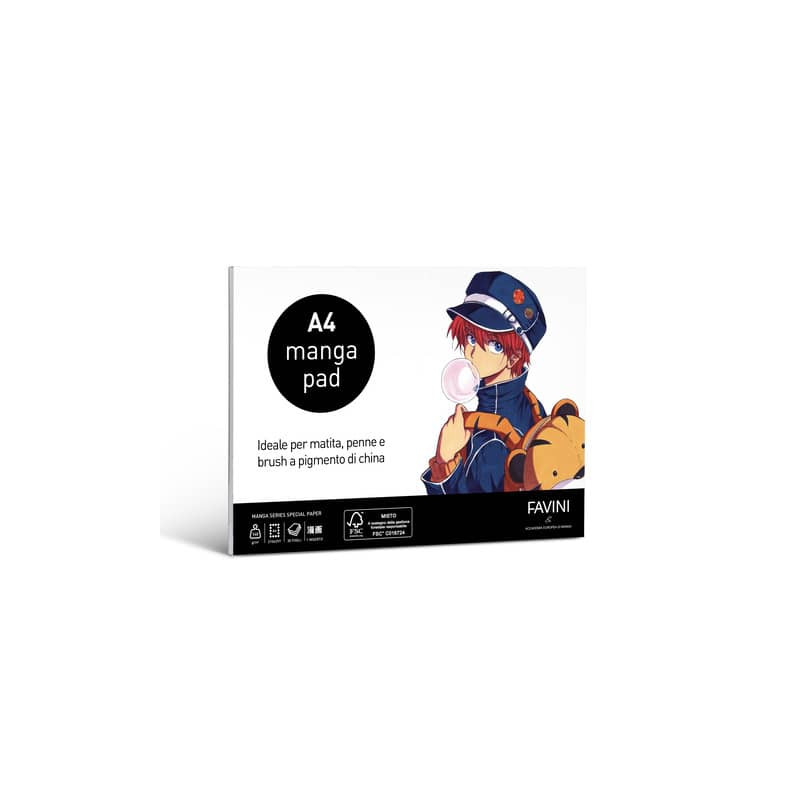 Blocco collato Favini in carta di altissima qualità, ideale per matita, penne e brush a pigmento di china. Pensato e realizzato in colaborazione con l'Accademia Europea di Manga e ispirato al mondo del disegno giapponese. Caratteristiche tecniche: liscio neutro, 140 grammi, 30 fogli. Formato A4. Carta FSC Mix.