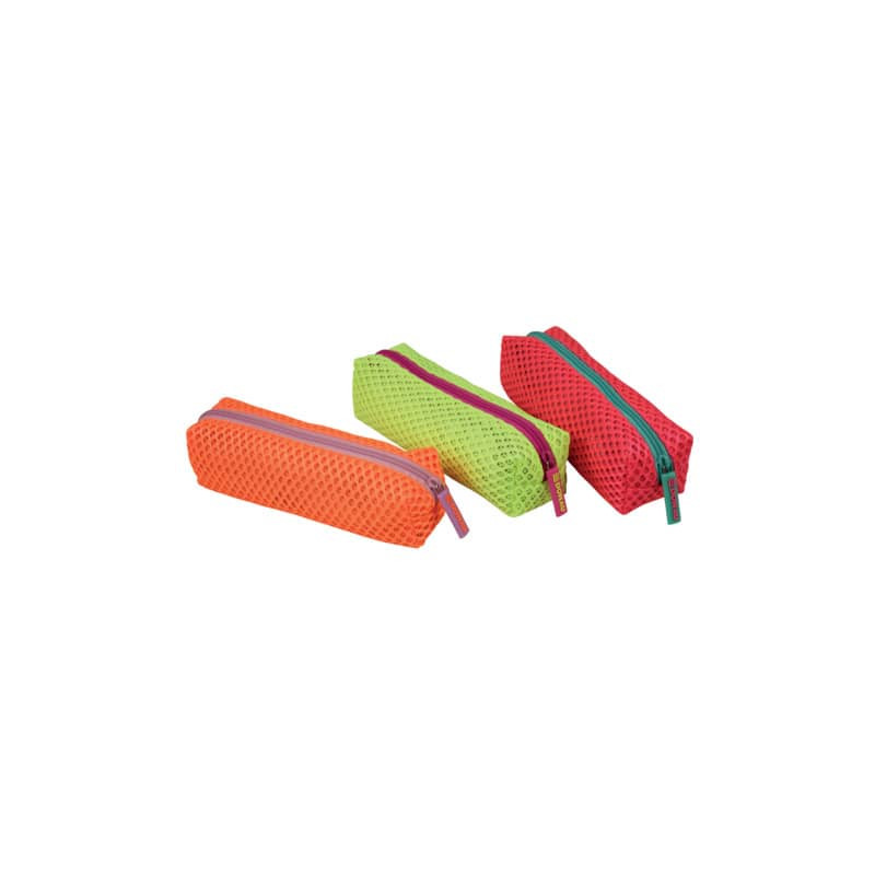 Astuccio a bustina con zip. Il motivo a rete lo rende un accessorio sportivo e pratico. Ideale per trasportare oggetti di cancelleria, quali: penne, matite, gomme. Utile sia a scuola sia in ufficio. Disponibile in 3 colori fluo assortiti con zip a contrasto: arancione con zip rosa, verde con zip fucsia, rosso con zip verde. Dimensioni: 23 x 7,5 x 6 cm.