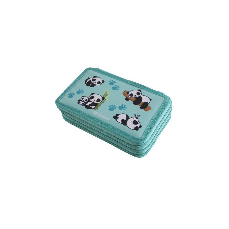 Astuccio a 3 zip imbottito rifornito di 43 pezzi: 1 gomma, 1 temperamatite, 3 matite, 1 righello, 1 orario scolastico, 18 pennarelli con punta in fibra e 18 matite colorate. Realizzato con fantasia a tema panda. Materiale: poliestere. Dimensioni: 200 x 130 x H.60 mm.