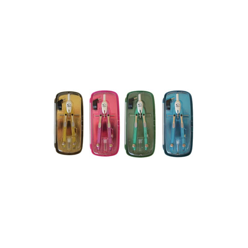 Compasso dotato di accessori per agevolare il disegno tecnico e permettere di tracciare archi e circonferenze in maniera precisa. Progettato per uso scolastico.