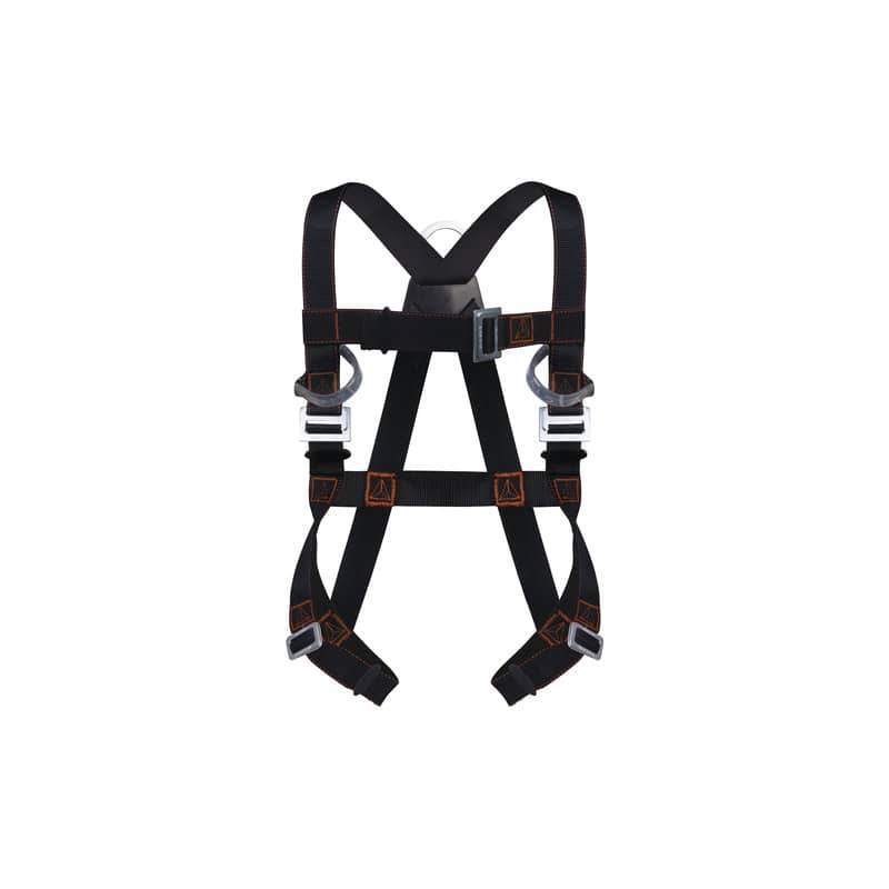 Imbracatura con 2 punti di ancoraggio anticaduta (dorsale - sternale). N°5 fibbie di regolazione. Cinghie in poliestere. Colore: Nero. Per le taglie S/M/L. Indicatore di caduta con facile verifica visiva. Testato a 150 Kg. Nessun problema legato al peso degli utensili trasportati o di altro.