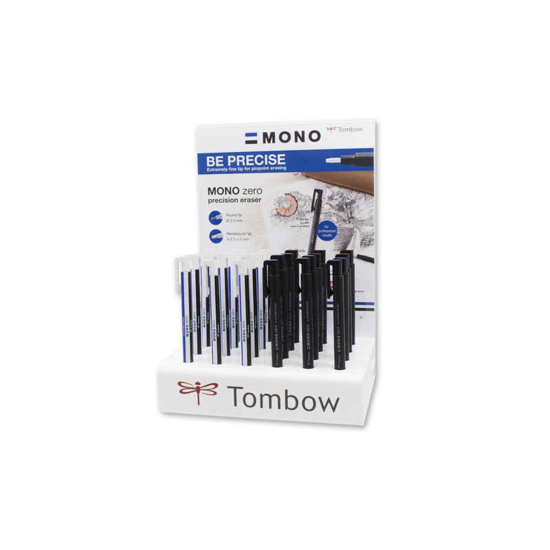 Espositore composto da 24 gomme di precisione Tombow Mono Zero con fusto nero oppure bianco a righe nera e blu. Disponibili in 2 punte: tonda con diametro 2,3 mm e rettangolare 2,5 x 5 mm. Dimensioni display da banco: 170 x 230 x 130 mm.