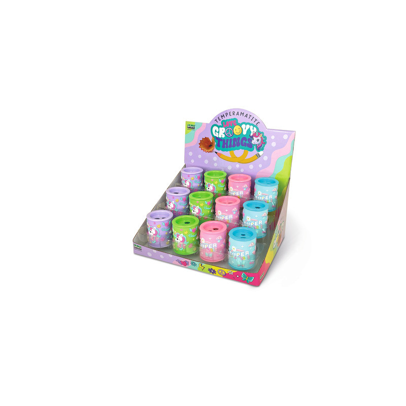 Temperamatite realizzato in plastica a 2 fori. Dotato di contenitore rivestito in morbida gomma con particolari 3D. Espositore composto da 12 temperamatite. Dimensioni espositore: b.25,5 x h.24 x p.20 cm.