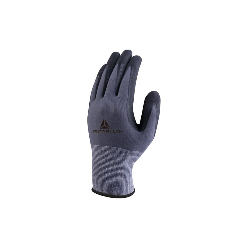 Guanto in maglia Poliammide/Spandex. Spalmatura nitrile/poliuretano su palmo e punta delle dita. Puntini nitrile su palmo. Finezza 15. Supporto : poliammide/Spandex. Spalmatura : nitrile/poliuretano. Puntini : nitrile.