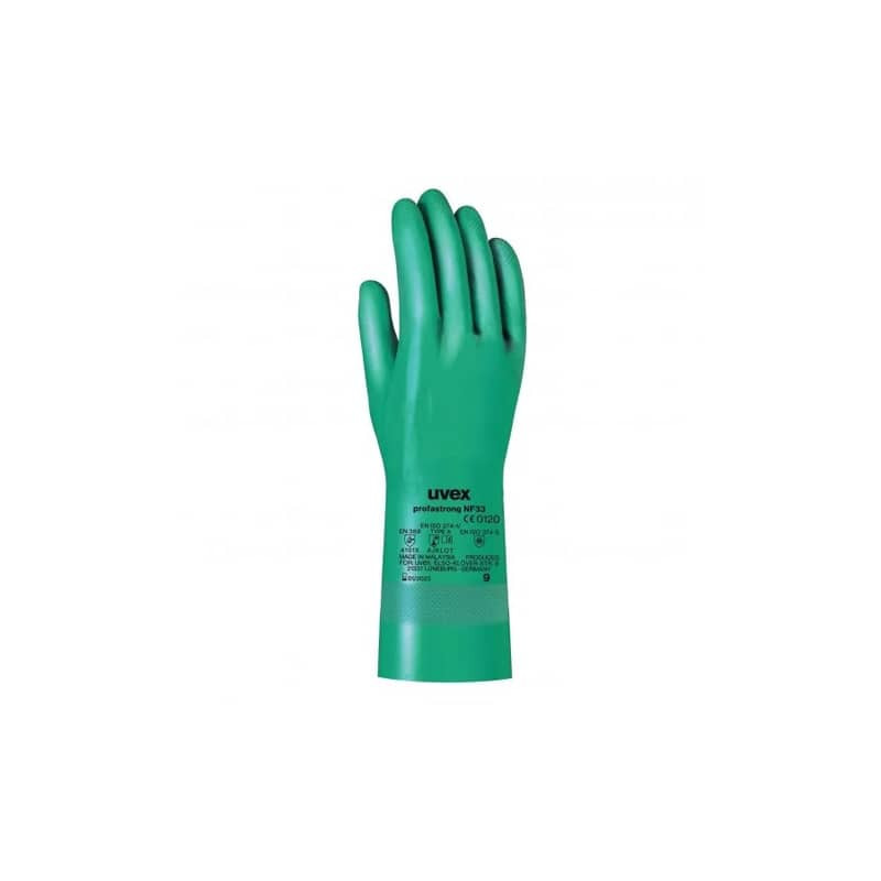 Guanto protettivo Uvex PROFASTRONG NF33 in nitrile e floccatura di cotone, per la manipolazione di sostanze chimiche. elevata resistenza all’abrasione, buona presa in ambienti umidi e asciutti grazie alla struttura GriP del palmo. buona resistenza a numerosi oli, grassi, acidi e alcalini. Buona sensibilità tattile fino alla punta delle dita. Ottima calzata ed elevata flessibilità. Campi d’impiego: ndustria automobilistica, industria chimica, industria tipografica, laboratori, industria alimentare, costruzione e vetrerie. Colore verde. Conformi alle normative EN 388 (4 1 0 1 X), EN ISO 374-1:2016, tipo A (A J K L O T).