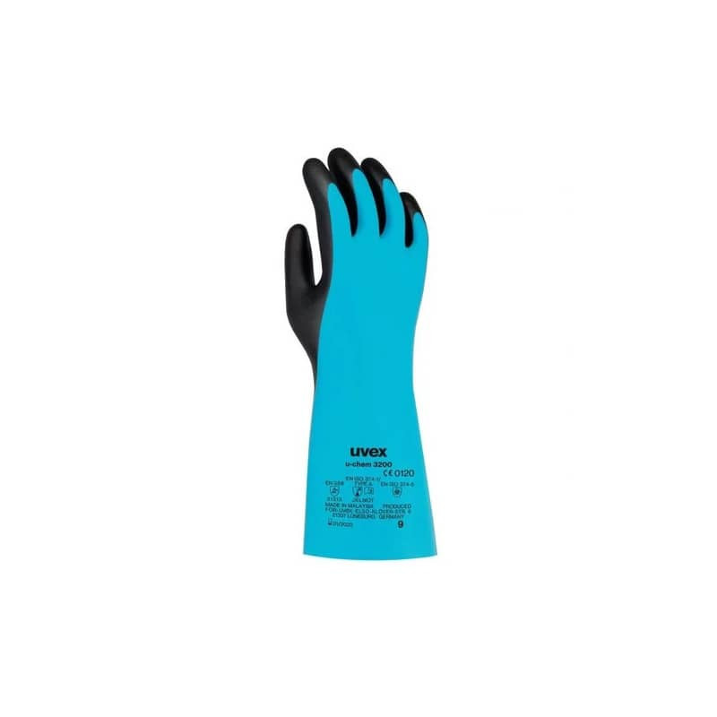 Guanti protettivi Uvex U-Chem 3200 in nylon con rivestimento NBR di circa 0,50 mm consigliati per rischi chimici. Buona presa in condizioni oleose, ottimi grip e vestibilità e buone proprietà meccaniche. Colore blu/nero. Campi di utilizzo: industria chimica, lavori di ispezione e manutenzione, lavorazione e trasformazione di metalli, edilizia, industria petrolifera e del gas. Conformi alle normative EN 388 (3 1 3 1 X) e EN ISO 374-1:2016 / Type A (J K L M O T).