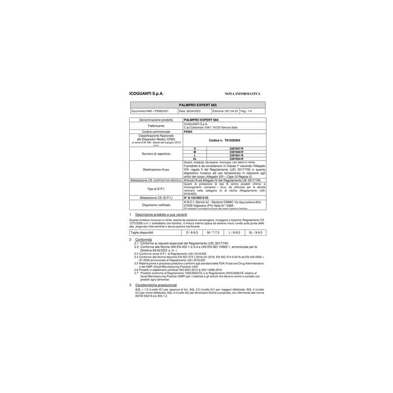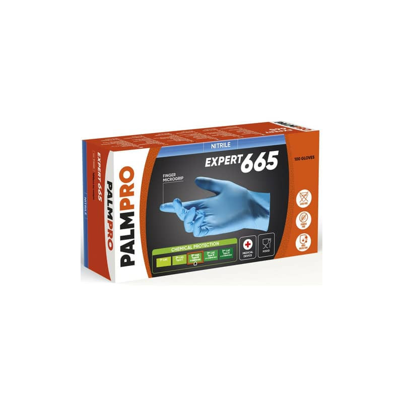 I guanti monouso ambidestri della linea Palmaro Expert 665 sono in nitrile e senza polveri. Si possono utilizzare per scopi medici, per esami, per il contatto con il cibo e contro rischi chimici e microbiotici. Non sterili. Il prodotto è da considerarsi in Classe I regola 5 del Regolamento (UE) 2017/745. Attestazione CE (Dispositivo medico). Tipo di D.P.I.: guanti di protezione di tipo B contro prodotti chimici e microrganismi, compresi i virus, da utilizzare per le attività rientranti nella categoria III di rischio (Regolamento (UE) 2016/425). Attestazione CE (D.P.I.) N° G-123-06212-23. Organismo notificato A.N.C.I. Servizi srl - Sezione CIMAC Via Aguzzafame 60/b 27029 Vigevano (PV) Italia N.° 0465. DPI sottoposto a sorveglianza da parte dello stesso Organismo Noti. Colore blu. Spessore palmo 0,08 mm (valore medio). Lunghezza 24 cm. In confezione da 100 guanti.