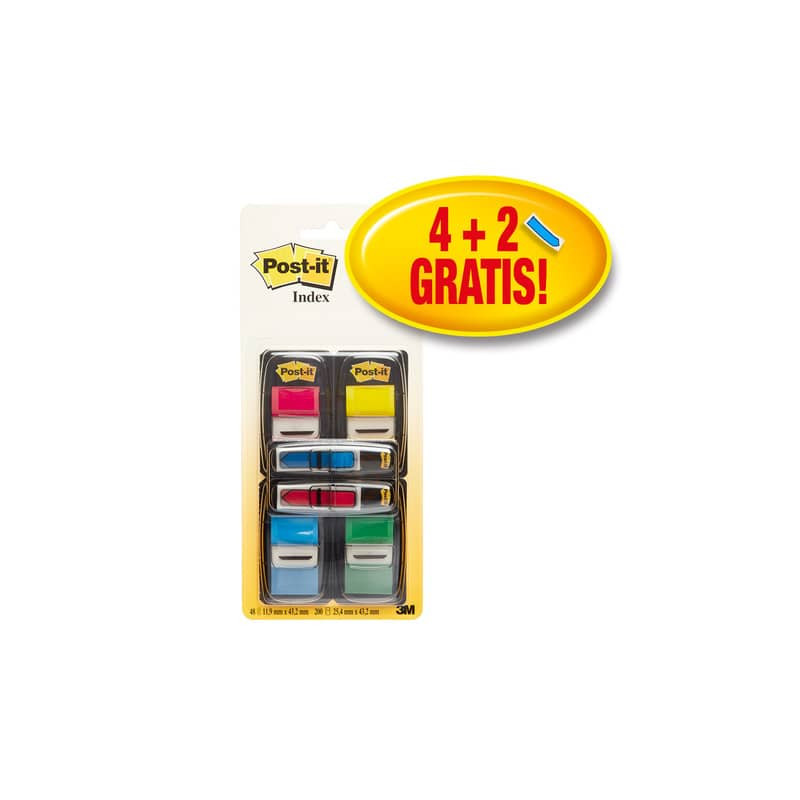 Segnapagina in formato medium, autoadesivi e removibili. Essenziali per contrassegnare e codificare con i colori i documenti. I segnapagina colorati Post-it® Index attirano subito l'attenzione grazie al colore e presentano una superficie scrivibile per la scrittura delle note o delle intestazioni. Riposizionabili e scrivibili, migliorano l'organizzazione del lavoro. Ogni confezione contiene 200 segnapagina (4 dispenser da 50 segnapagina) di dimensioni 25,4x43,6 mm e da 48 mini frecce (2 dispenser x 24 mini frecce). Confezione promozionale da 4 dispenser Post-it® 680 + 2 dispenser Post-it® Mini 684 Freccia GRATIS.