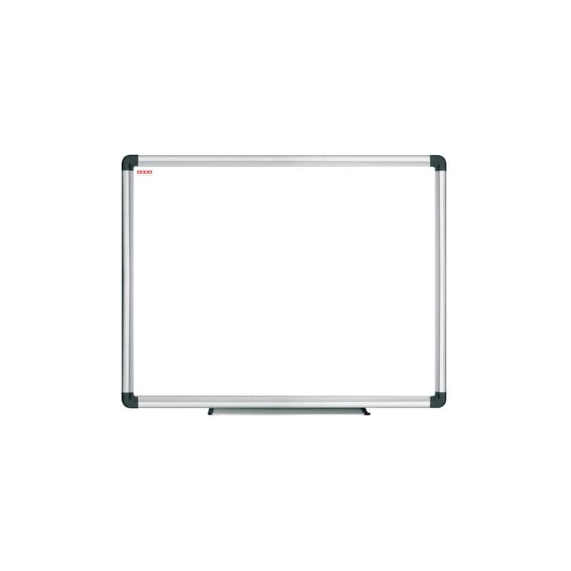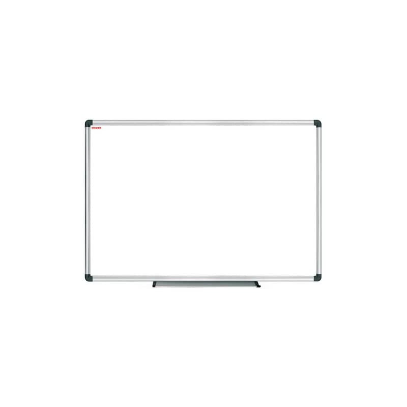 Lavagna magnetica con cornice in alluminio anodizzato. Superficie bianca in acciaio. Con vaschetta portaoggetti in alluminio e coprispigoli in plastica. Viti per fissaggio al muro orizzontale e verticale.