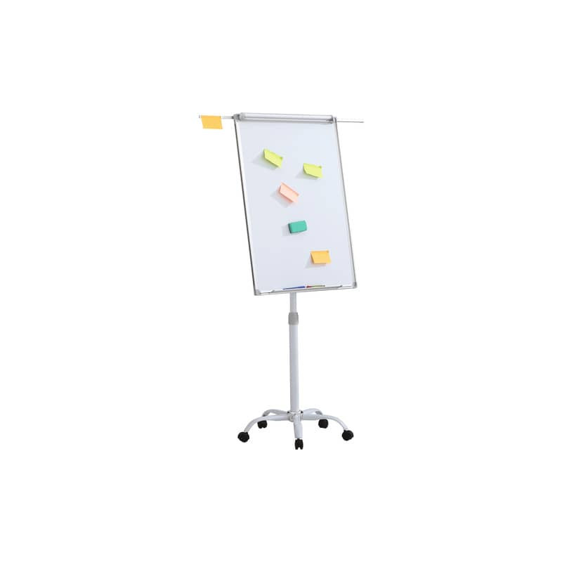 Lavagna magnetica cancellabile a secco con fogli mobili. Design mobile su rotelle. Telaio e cornice in alluminio. Superficie laccata liscia. Dotata di un ripiano integrato per gli accessori di scrittura. Dotata di una maniglia funzionale per attaccare il blocco di carta. Dimensione della tavola 70x100 cm. Colore bianco.