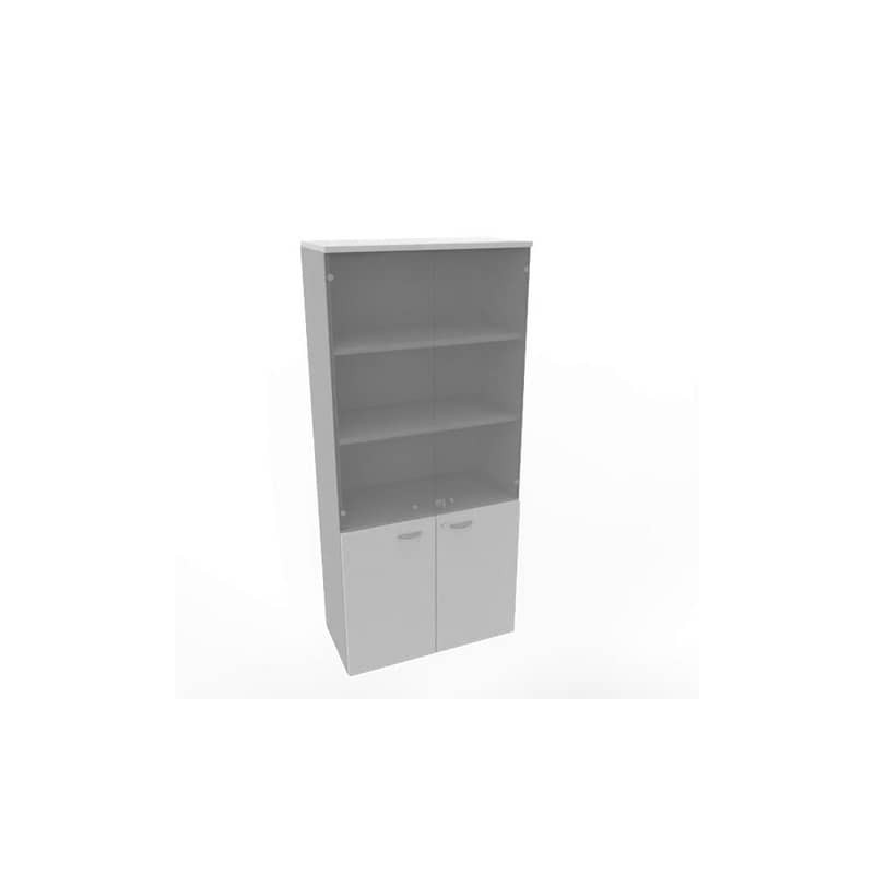 Coppia mobili medio/alti a giorno cm 162,8 X 43 X 158,2 h, 3 ripiani regolabili per mobile. Struttura colore grigio alluminio. Top e fianchi finitura (sp. 14 mm) colore nero venato frassino e ciliegio arabis. Top, base e fianchi sp. 18 mm. Ripiani regolabili in altezza sp. 25 mm. Schiena sp. 10 mm. Piedini livellabili dall’interno. Disponibili moduli singoli (L82,8 cm), doppi o a tre con top finitura unico (L162,8 cm/L242,8 cm). I mobili possono essere allestiti a giorno o completi di ante con maniglie in metallo e serratura. Le ante sono disponibili in tutte le altezze nella versione in melaminico (sp. 18 mm) o in vetro fumè/melaminico (sp. 5/18 mm) per il mobile basso e per quello medio-alto.