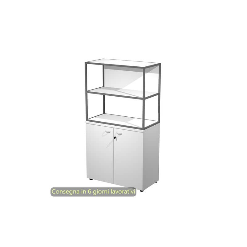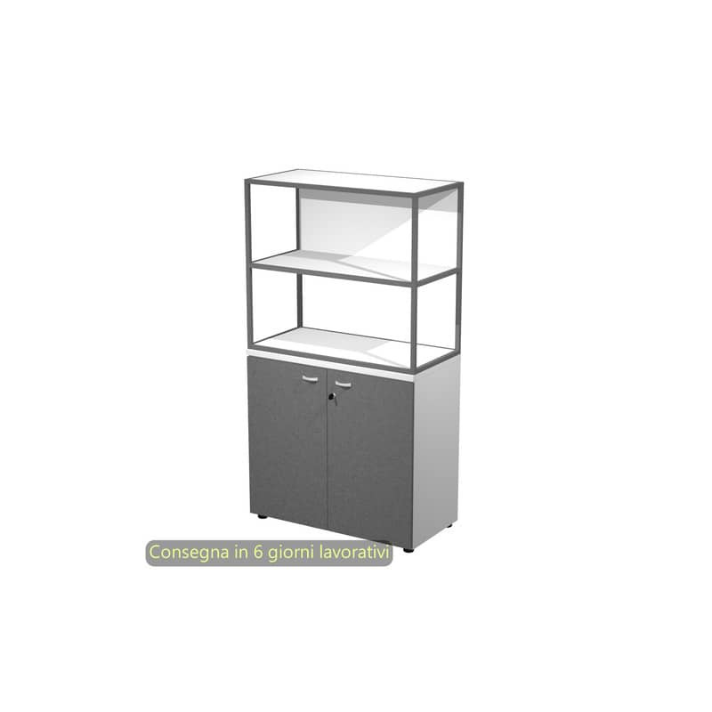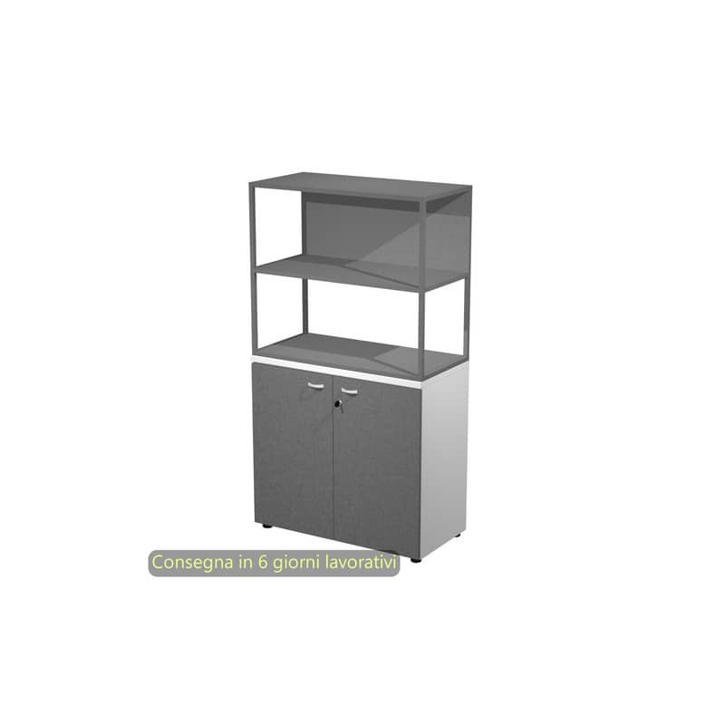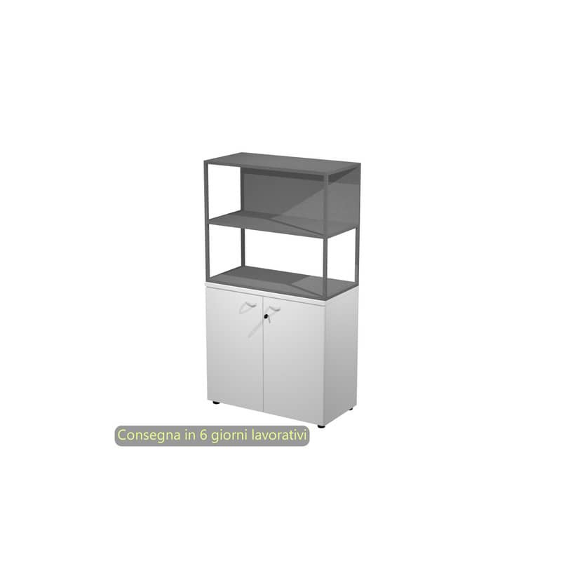 Armadio alto + ante alte battenti melaminico serratura 90 x 45,8 x 200h. Realizzati in robusto melaminico bilaminato antigraffio ed antiriflesso conforme alle norme UNI e EN classe E1. Ante battenti alte e basse in melaminico bilaminato (sp. 18 mm, con serratura ad eccezione delle ante dei sopralzi) e medie in vetro temperato satinato senza serratura (sp. 5 mm). Maniglie in ABS antiurto finitura alluminio. Dotati di 4 solidi ripiani in alto spessore (25 mm), 3 riposizionabili ed 1 fisso. Rifiniti posteriormente possono essere utilizzati come pareti divisorie. Dotati di piedini regolabili in altezza per un perfetto livellamento.