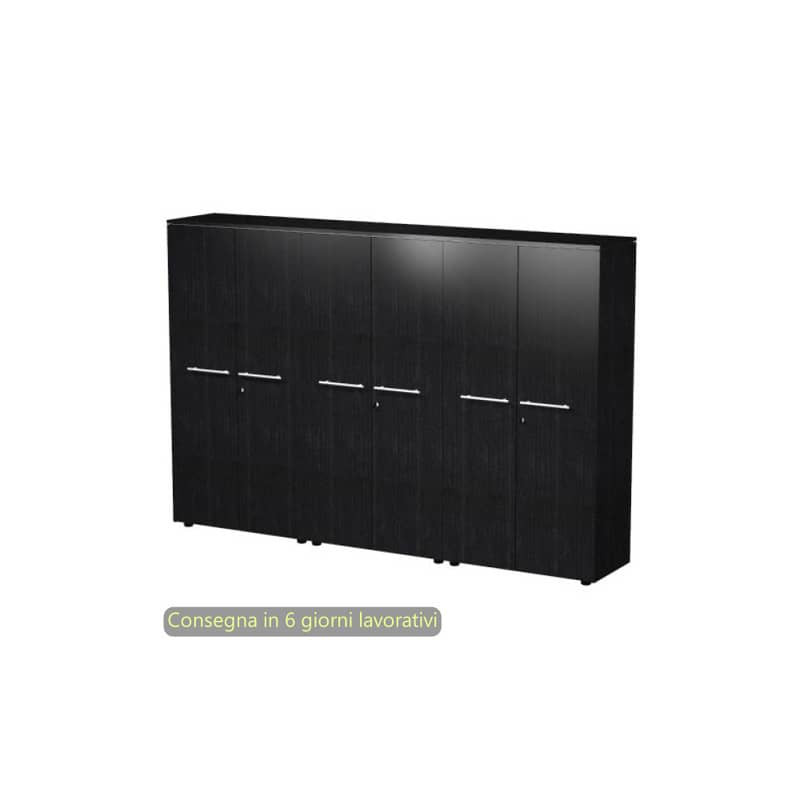 Composizione da tre armadi medi con ante in melaminico con serratuta completa di top e fianchi finitura con spessore 14 mm. Colore: nero venato frassino. Dimensioni: 242,8 x43xH.119,8 cm. Produzione interna Artexport della parte in legno certificata Iso 9001. Certificazioni FSC e PEFC. Imballi totalmente in cartone per un facile riciclo, a basso impatto ambientale.