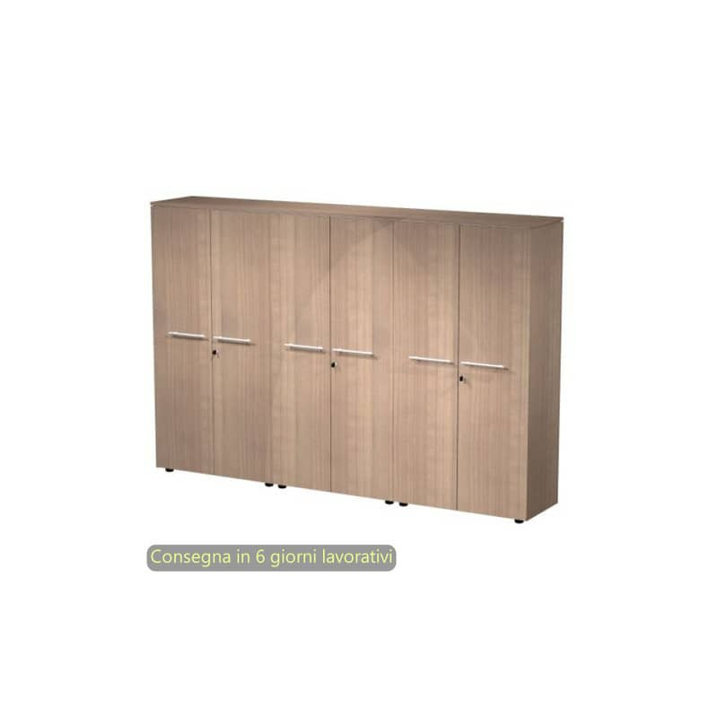 Composizione da tre armadi medio-alti con tre coppie di ante in melaminico con serratura. Completa di top e fianchi finitura. Colore: ciliegio arabis. Top e fianchi finitura spessore 14 mm. Dimensioni: 162,8x43xH.158,2 cm. Produzione interna Artexport della parte in legno certificata Iso 9001. Certificazioni FSC e PEFC. Imballi totalmente in cartone per un facile riciclo, a basso impatto ambientale.