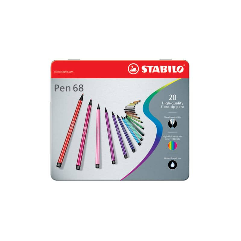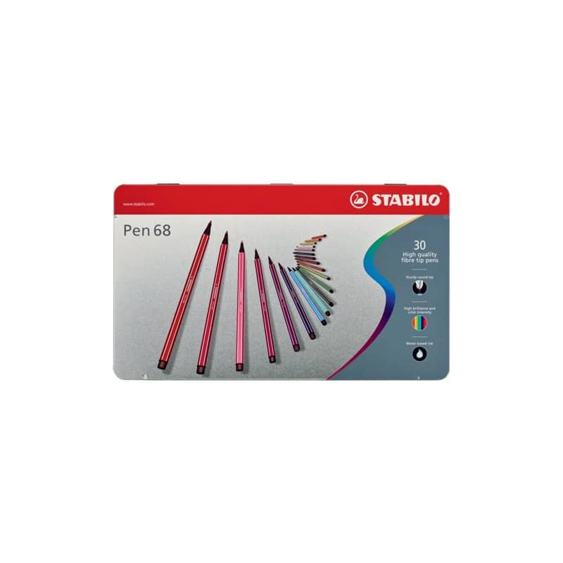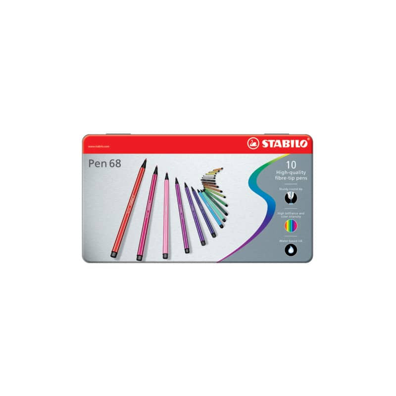 Pennarello Pen 68 con inchiostro a base d'acqua, resiste senza cappuccio fino a 24 ore, cappuccio ventilato. Confezione colori assortiti in scatola di metallo da 10, 20, 30, 40 o 50 pezzi.