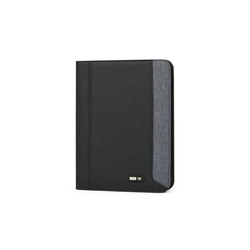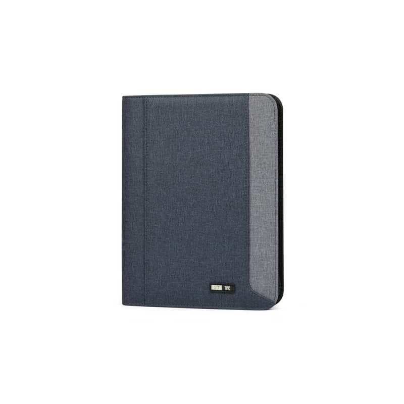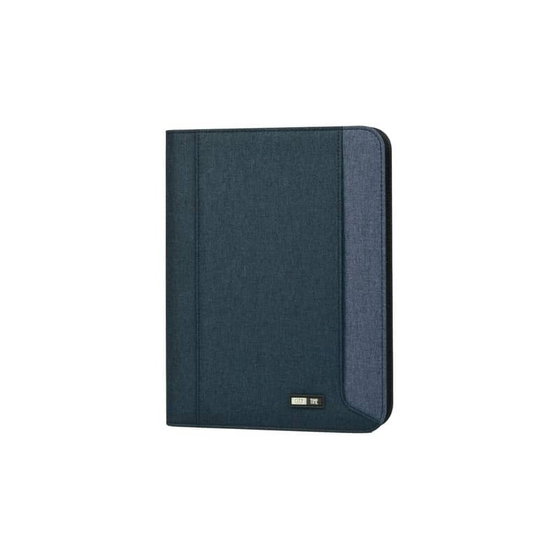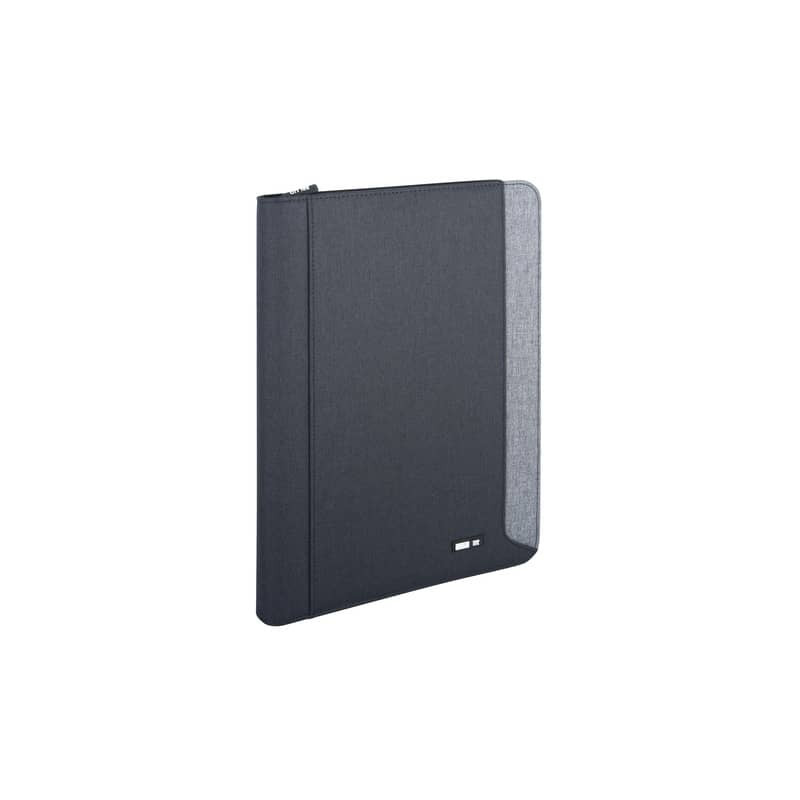 Portablocco in tessuto bicolore, chiusura con cerniera. Tasca interna con vari scomparti, completo di blocco, formato A4.