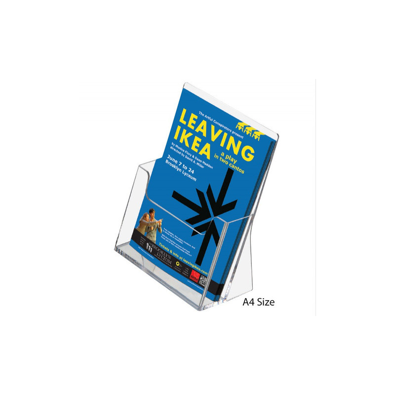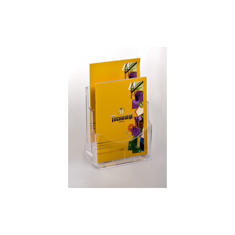 Porta brochure/cataloghi trasparenti da banco realizzati in PS a tasca singola. I fori posteriori consentono il montaggio a parete. Il formato A4 c'è anche nella versione a due tasche e ha in dotazione un separatore, che permette la creazione di doppi spazi in formato 1/3 A4.