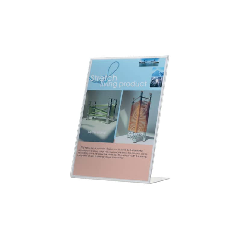 Porta-avvisi in polistirolo con base a L. Colore trasparente. Inclinato per una buona visibilità. Ampia base stabile.