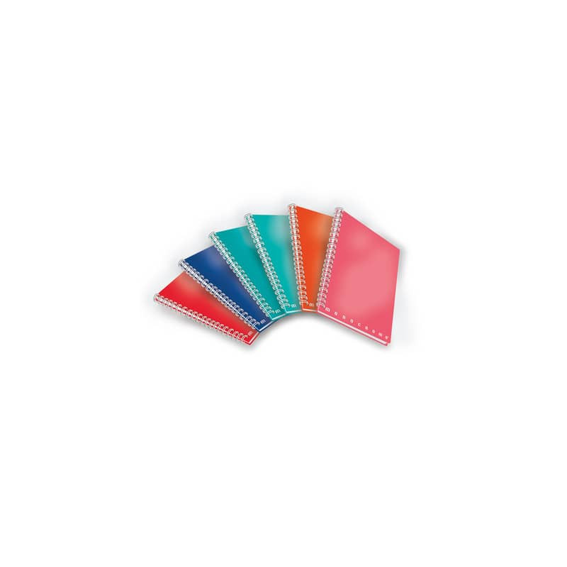 Quaderno A5 con spirale, senza fori archivio, composto da 80 fogli da 70 grammi. Copertina e retroblocco in polipropilene da 500 my. Colori assortiti trasparenti, spirale in plastica trasparente riciclabile.