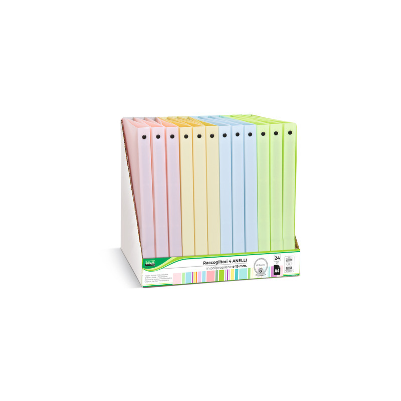 Espositori composti da raccoglitori Lebez realizzati in PP con meccanismo a 4 anelli. Disponibili in colori pastello assortiti.
