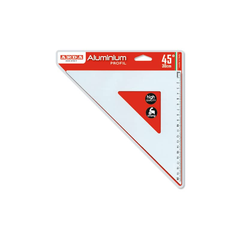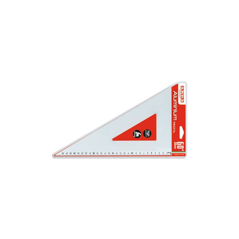 Coppia squadre serie Profil in alluminio con angoli da 45° e 60°. Lunghezza 12 cm calcolata sull'ipotenusa per la squadra da 45° e sul cateto maggiore per la squadra da 60°. Smessate e con angoli arrotondati per garantire la massima sicurezza. La graduazione, in tampografia con numeri in colore nero, facilita la lettura e garantisce la massima precisione. Conforme alle norme UNI.