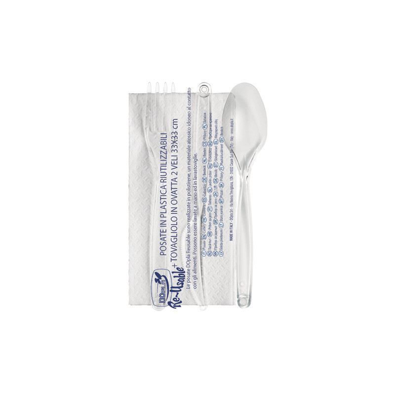 Set composto da posate e tovagliolo. Le posate sono realizzate in PS mentre il tovagliolo è in ovatta. Prodotto riutilizzabile. Non adatto all'uso in forno. Idoneo al contatto con alimenti: fino a una temperatura massima di 70 °C per 2 ore. Confezione composta da 100 pezzi.
