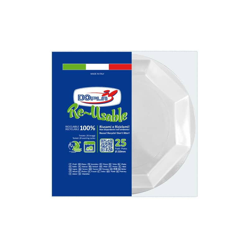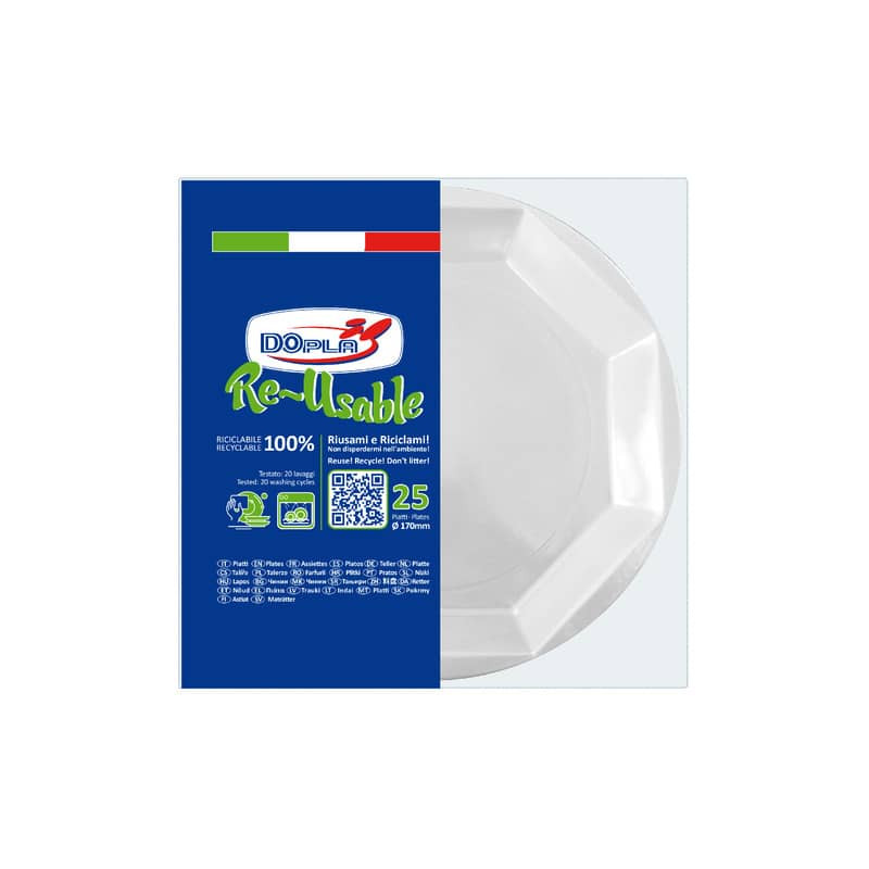 Piatto in polistirene per uso quotidiano certificato ReUse lavabile a mano ed in lavastoviglie testato fino a 20 lavaggi a 65° (cert. EN 12875-1).