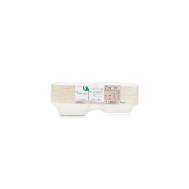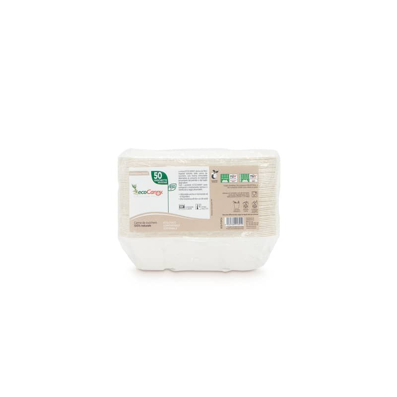 Prodotto ecologico derivante da fibre vegetali estratte dalla canna da zucchero; 100% biodegradabile e compostabile, smaltibile nell'organico. Idoneo al contatto con gli alimenti come da regolamento (CE) 1935/2004 e D.P.R. 777/1982. Alta resistenza al peso, ai liquidi, ai cibi grassi e salati. Utilizzabile in microonde per max 6 minuti a 800 W. Utilizzabile in forno per max 30 minuti a 120 °C. Utilizzabile in freezer a -18°C e in frigo. Confezione riciclabile nella plastica. Etichetta smaltibile nella carta.