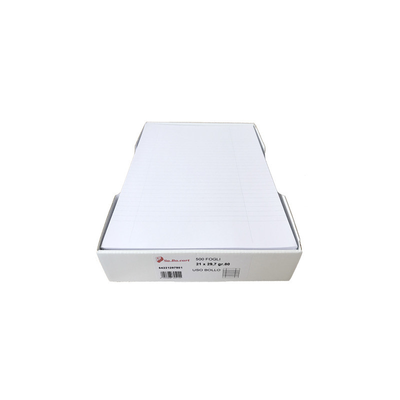 Carta uso bollo in formato A4 a righe con margine. Grammatura: 80 g/m². Risma composta da 500 fogli.
