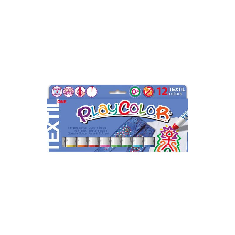 PlayColor tempera solida in stick adatta per creare fantastici disegni sui tessuti. 12 colori assortiti. Istruzioni : dopo aver steso il colore lasciare riposare per 3 ore, quindi stirare applicando un foglio sopra al disegno, a 40° per 3-4 min., oppure con un phon per 6-8 min.. Temperatura max di lavaggio in lavatrice 60° .