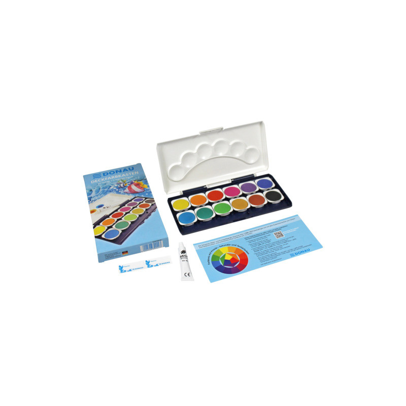Acquerelli in colori assortiti. La valigetta si compone di 12 godet quadrati estraibili e 1 tubetto di tempera bianca coprente da 7,5 ml. È presente inoltre una avolozza di miscelazione integrata nel coperchio. Dotati di etichetta scrivibile e istruzioni per la teoria dei colori/ruota dei colori. Dimensioni valigetta: 21 x 2 x 11,4 cm.